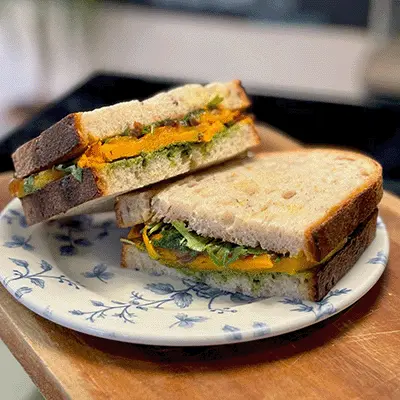 Roast spiced butternut squash, caramelised onions, homemade vegan nut free pesto with leafy greens, served on Tartine organic four seed sourdough.