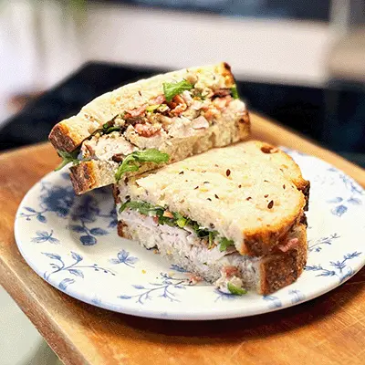 Roast Irish chicken breast, crispy bacon bits, sage and onion stuffing, mayo and rocket leaf, served on Tartine organic four seed sourdough.