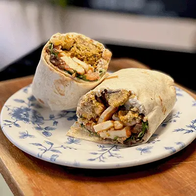 Homemade spiced chickpea falafel, caramelised onions, roast halloumi, thinly sliced beef tomato, garlic and cucumber yogurt sauce, and fresh rocket, served on a tortilla.